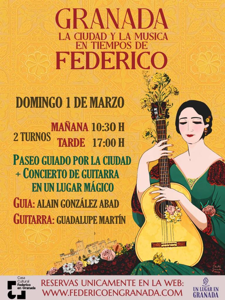 En colaboración con la Casa Cultural Federico en Granada, Alain González nos guiará en un paseo por nuestra ciudad, entre cármenes y callejuelas donde aún resuenan la guitarra, el cante jondo y antiguas melodías renacentistas. Evocaremos la amistad de Federico García Lorca con Manuel de Falla y con Ángel Barrios, grandes protagonistas musicales de la Edad de Plata en Granada. El paseo culminará con un concierto de guitarra clásica en Un lugar en Granada (solo en la ruta de la mañana, en la de la tarde será en otro lugar) a cargo de Guadalupe Martín, a quien ya hemos tenido el privilegio de escuchar en nuestro patio.